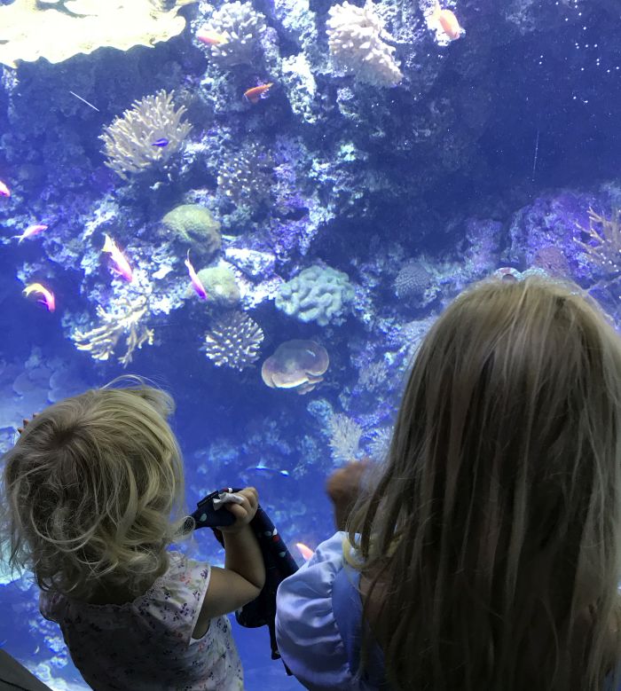 Akvariedelen är stor med många akvarier och det tar lång tid att går runt den. För oss var det först i sjuårsåldern som äldsta dottern orkat och velat se hela, medan den yngsta i femårsåldern tröttnade halvvägs. Har man barn i olika åldrar kan det därför vara bra att göra en plan innan – kanske är det smartare att dela upp sig, eller sätta sig en stund på bänkarna i mitten med de yngre barnen.