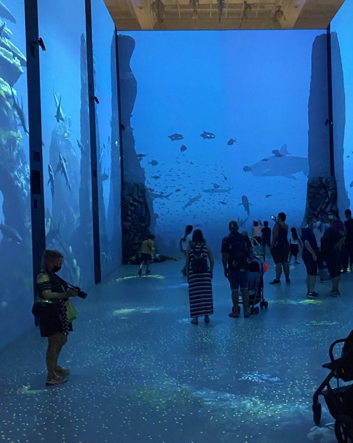 Akvariedelen är trång, mörk och ofta full i folk. Första gången vi besökte den var barnen två respektive fyra år, och det var en riktigt utmaning att hålla koll så att de inte skulle försvinna. Det går att ta sig fram med en liten vagn, men om det är mycket folk är det klurigt.