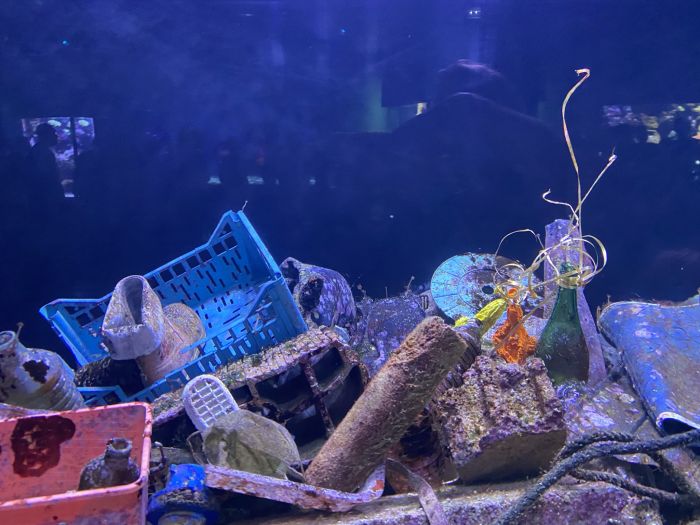 Ett av akvarierna innehåller en installation av skräp som hittats i havet, vilket är en bra påminnelse om att så mycket av det vi slänger hamnar i havet och ett passande tillfälle att prata med barnen om vikten av att ta vara om våra hav.