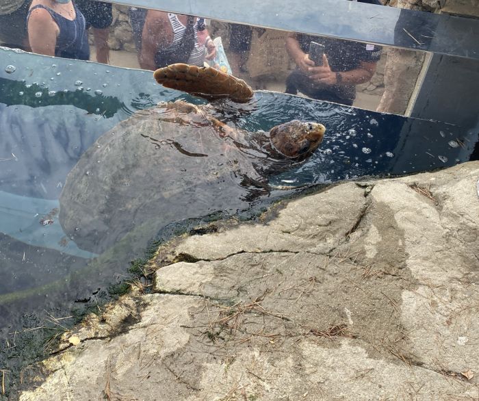 Ungefär halvvägs genom akvariedelen – innan den vänder – finns en möjlighet att gå ut för att titta på sköldpaddor, varav några befinner sig i en rehabiliteringspool för att snart släppas tillbaka i havet. Det är en bra liten paus, och det kan vara ett bra läge att ha med något diskret snacks i fickan och ta en minipaus.