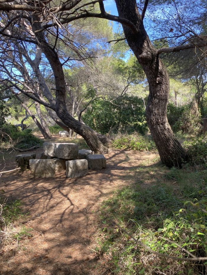 Vill man inte klättra ned till någon av alla de fina vikarna nära havet finns det picknickbord uppsatta runt om ön, och gott om naturligt avskilda picknickplatser. Med små barn kan det vara mysigare att bara ta en paus under träden och låta barnen leka med pinnar, kottar och andra skatter.