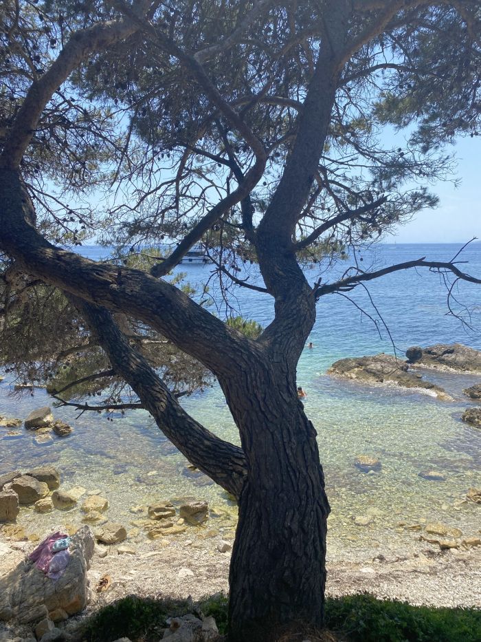 Ön genomkorsas av stigar och man kan med fördel bara strosa och se var man hamnar. Till höger (från båten sett) finns en typ av strand, men de gånger vi varit där har den varit täckt av sjögräs och inte jätterolig att bada från. Vi har istället hittat mysiga vikar på andra sidan ön.
