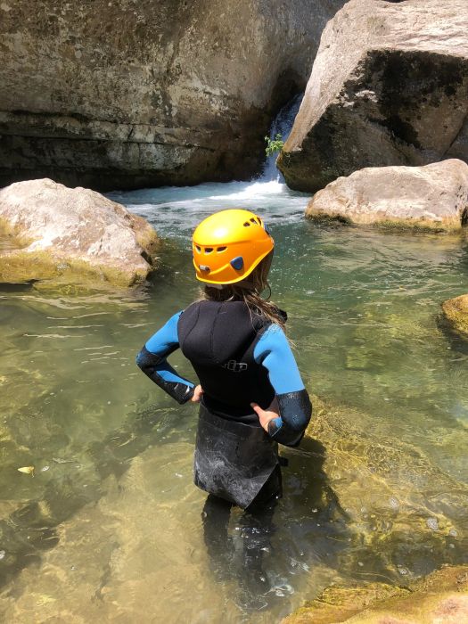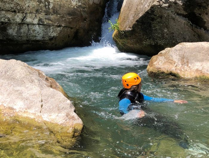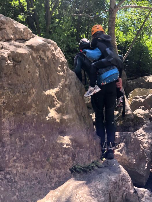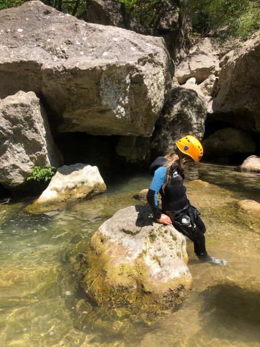 Med barn över 12 år och vuxna kan man boka riktig canyoning, men för mindre barn är en ”Rando Aquatic” eller ”Aquatic Discovery” ett bra och roligt alternativ. Vi bokade med Funtrip i Pont du Loup, men det finns många andra företag som erbjuder liknande tjänster. Hos Funtrip bokade vi två familjer tillsammans och guiden anpassade då hela turen efter oss, och då förstås framförallt barnen som var mellan fem och nio år. Det innebar att vi inte använde oss av några rep för att fira ned oss och att hopp och liknande var relativt låga.