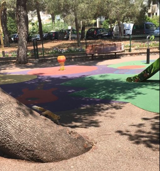 Parken bjuder också på en riktigt fin lekpark med ett par klätterstrukturer och några mindre lekgrejor. Våra barn har gillat den skarpt, och det brukar vara skönt att som förälder få sätta sig på en bänk medan barnen leker. Parken är inhägnad och de gånger vi har varit där har det bara funnits en grind, vilket gör att man inte behöver vara rädd att barnen skall försvinna iväg ut. Det har heller inte varit för mycket folk, och träden ger lite skugga även mitt på dagen.